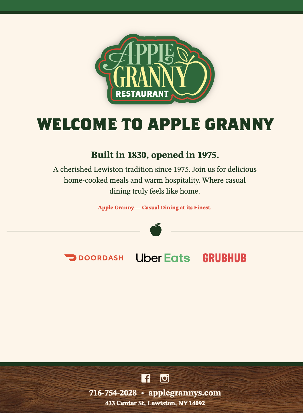 We are excited to announce a few Winter changes here at Apple Granny Restaurant. Beginning Sunday January 18th we will start a limited Breakfast menu being served from 8am to noon. The restaurant will now close at 4pm on Sundays during winter. Our traditional menu will be available 12-4pm. Stop in and check it out. Reservations accepted 716-754-2028.